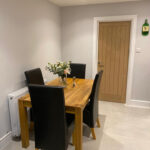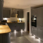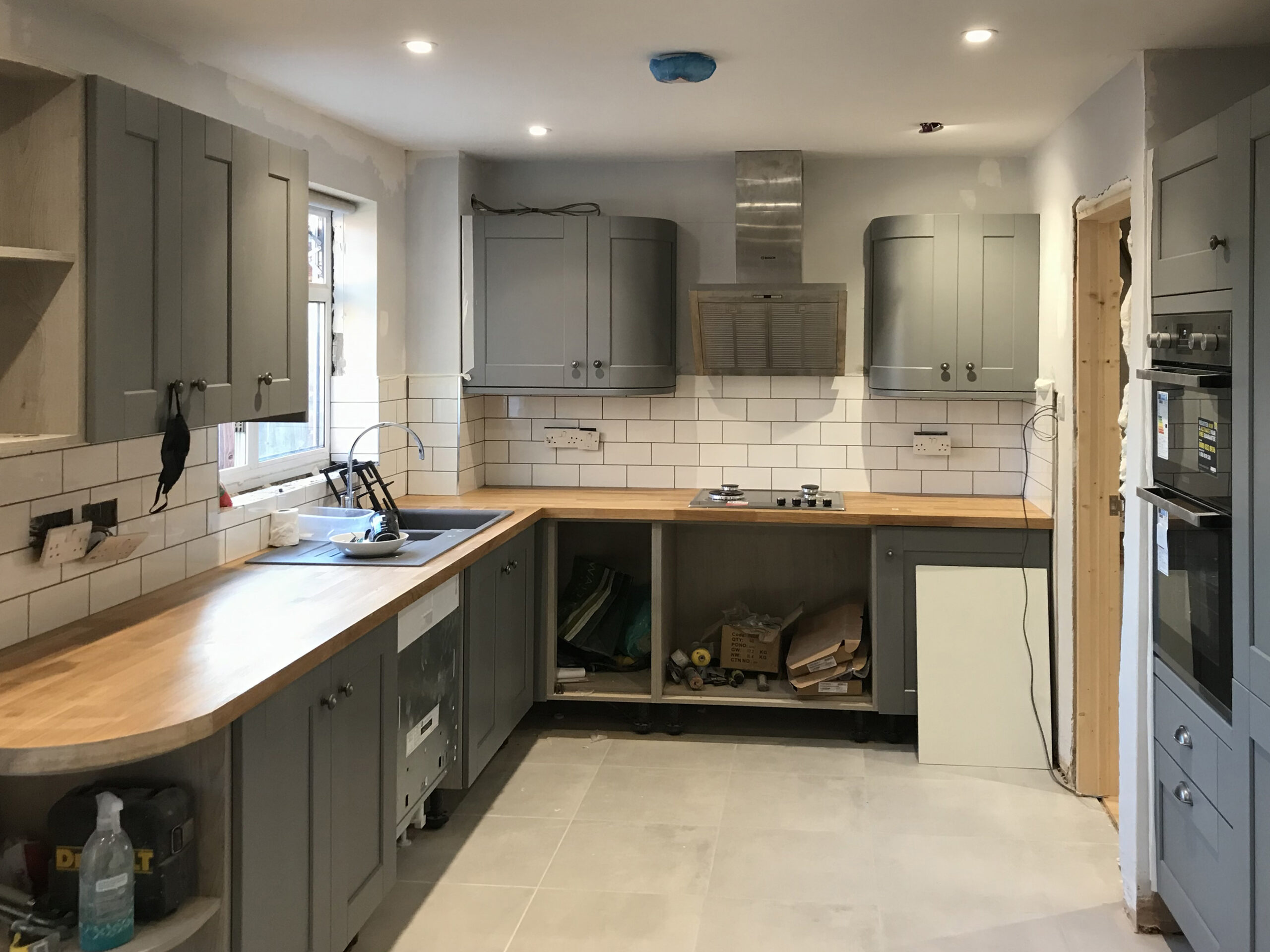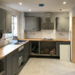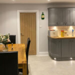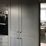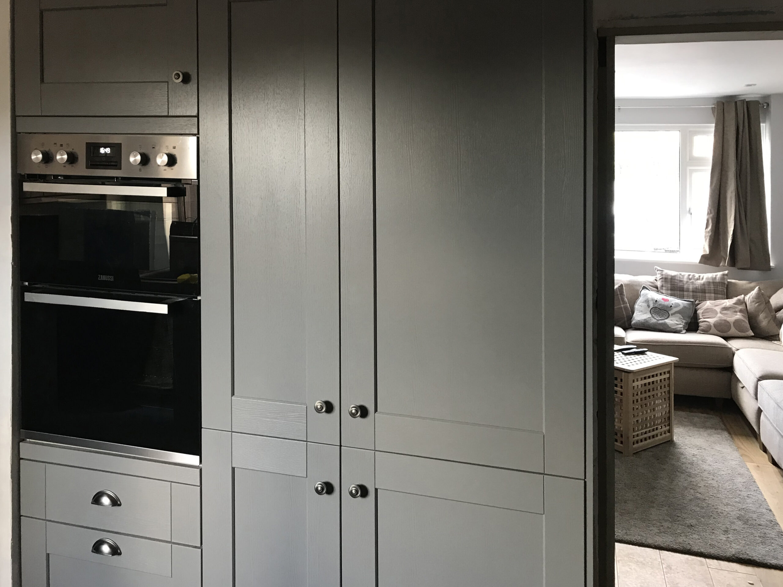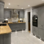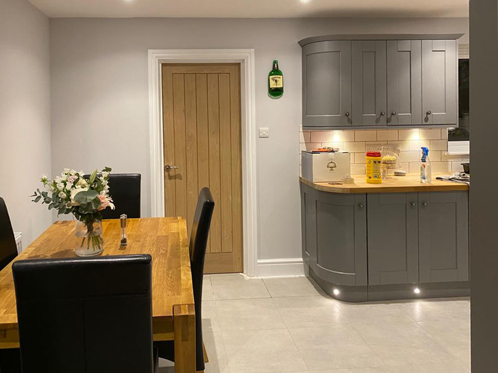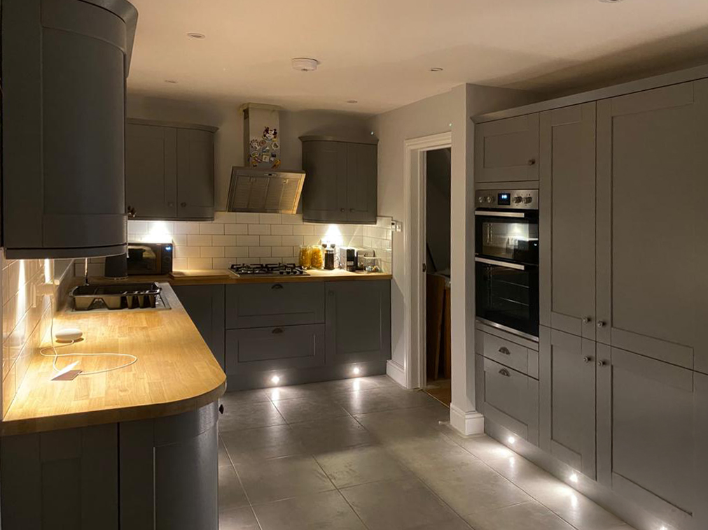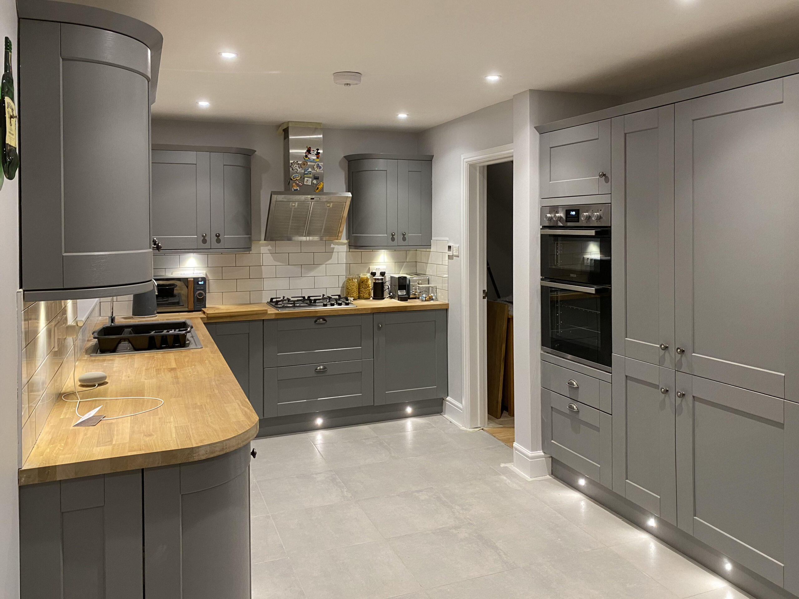 The new Shaker-style cabinetry is finished in a popular, elegant soft grey paint, immediately making the room feel larger and brighter. By moving to a tailored design, we were able to include full-height pantry storage and build in all the appliances, including the double oven, for a clean, uncluttered look. The use of warm, solid wood countertops and curved end cabinets softens the room’s edges, while integrated under-cabinet lighting adds a beautiful finish. This project proves how a custom design can perfectly combine style, high-quality storage, and a much-improved working area.
